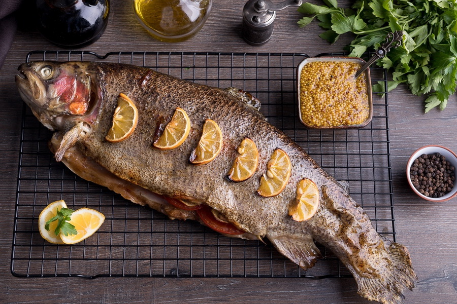 Es gibt einen Raubfisch. Sie können Forellen, Sibas oder Dorado nehmen. Das Minimum an Kochen und Abendessen ist bereits auf dem Tisch. Fisch reinigen die Waage, waschen und trocknen mit einem Papiertuch. Salse und scheinen außerhalb und von der Mitte zu schmecken. Finden Sie Zitronensaft und schmieren Sie Pflanzenöl. Legen Sie den Fisch auf ein Backschalen und legen Sie die Zitronenscheiben nach oben. Gebacken bei einer Temperatur von 180 ° C zu einer goldenen Kruste. Mit französischem Senf und einer Lieblingsguckung servieren.