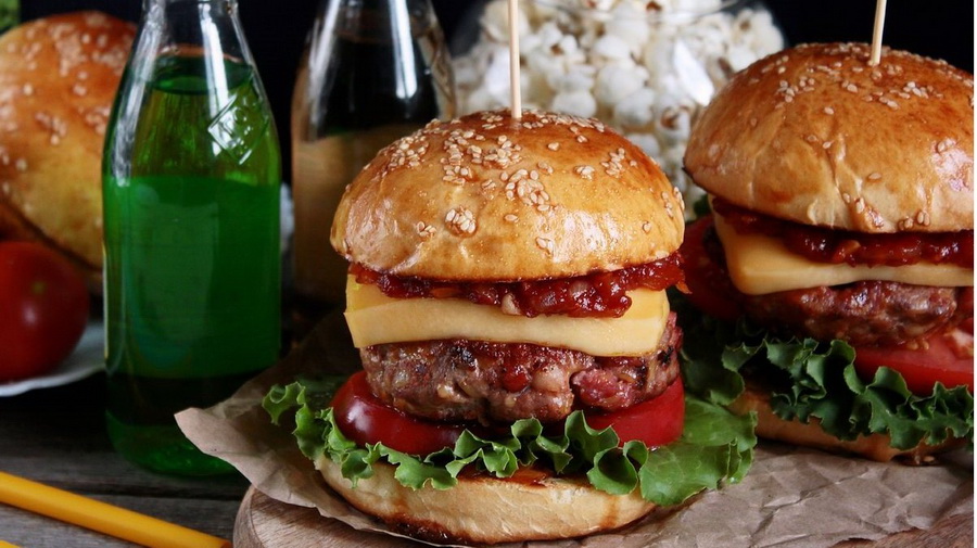 Schnell und leicht zu kochen Burger zu Hause, aber es wird viel nützlicher sein. Nehmen Sie 400 Gramm Rindfleisch, fügen Sie Salz und Pfeffer zum Geschmack hinzu, mischen Sie gründlich. Bilden Sie die Koteletts in der Größe der Brötchen, eine Höhe von 1 Zentimeter. Den Grill auf die maximale Temperatur vorheizen, und auf beiden Seiten beidseitig die Koteletts für 6 Minuten braten. Brötchen teilen sich in der Hälfte, fettiger Mayonnaise, Ketchup und Senf. Legen Sie ein dünnes Stück Käse, Salatgrün, einen Ring der Zwiebeln, einen Tomatenring und eine Kitzel. Schließen Sie den Burger mit dem oberen Teil des Brötchens. Du kannst schon schmecken!