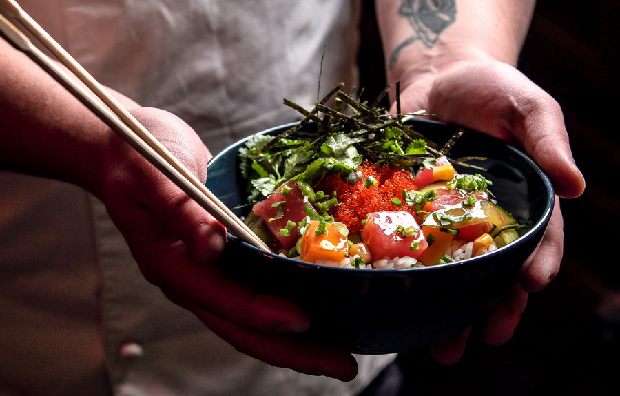 Hawaiischer Reissalat, Fisch und Gemüse. Es heißt Lazy Sushi. Sie müssen die Rollen nicht einfrieren und einwickeln, sondern dasselbe schmecken. 1 Tasse Reis für Sushi-Müllkippe in 1,5 Tassen Wasser. Wir machen eine Reissauce: 0,5 Glas Reisvinzeleglement mit 4 TBSP. Zucker und eine Prise Salz. Hotsauce gießen. Schneiderote Fischwürfel, Avocado, Gurke. Fügen Sie sie zu Reis, Wasser Soja-Sauce hinzu, streuen Sie mit Sesam-Samen und Algenburrow. Sie können auch Spawn und Grüns hinzufügen.