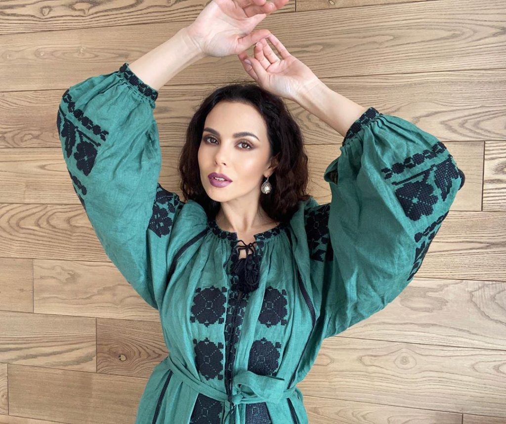Die reiche Smaragdfarbe des Kleides des Sängers des Sängers ist einfach luxuriös. Sein Foto von Kamenky bestätigte seine Meinung auf den Bericht darüber, dass die ukrainische Stickerei ein Symbol für Kraft und Schönheit ist.