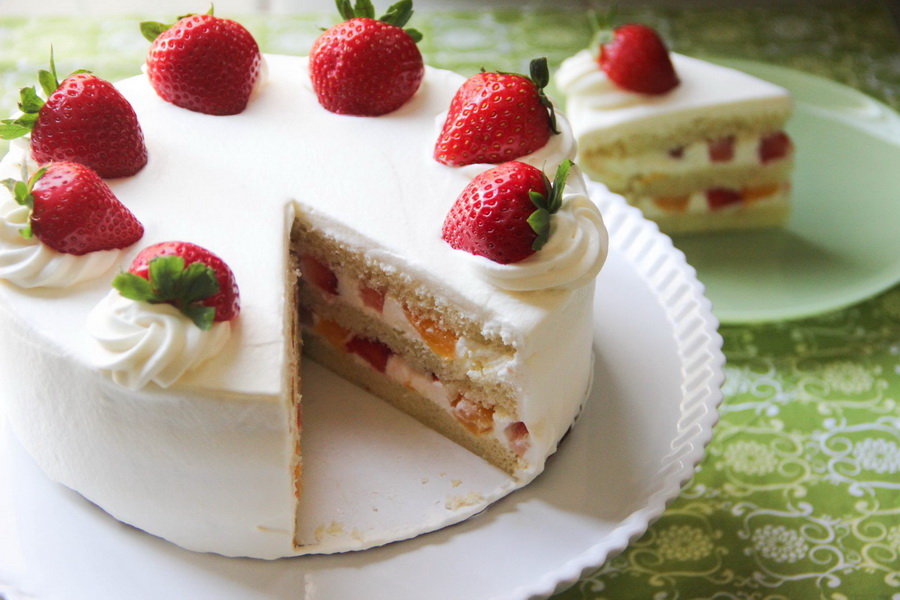 Die Eiweiß- und Zitrone-Codes schieben, allmählich Zucker hinzufügen. Sie müssen harte Gipfel bekommen. Eigelb mit Vanilleextrakt, fügen Sie Milch und Butter hinzu. Fügen Sie Mehl hinzu und mischen Sie eine homogene Konsistenz. Hinzufügen von peitschten Eiweiß. Teilen Sie den Teig in zwei Teile. Schmieren Sie die geformte Butter. Legen Sie einen Teil des Teigs darin. Backen Sie 20 Minuten bei einer Temperatur von 160 ° C. Dasselbe tun mit dem zweiten Teil des Teigs. Gib Pies, um zu verweilen. Schmieren Sie die Kuchen mit Schlagsahne und setzen Sie Erdbeeren. Legen Sie einen Kuchen in die zweite. Schmieren Sie sich von der oberen Torte mit Sahne und dekorieren Sie mit Erdbeeren.