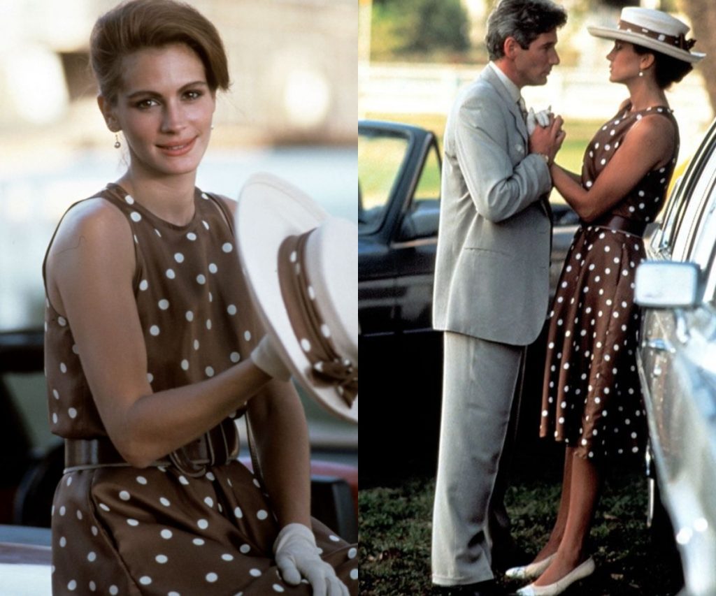 Das erste, und vielleicht das berühmteste Kleid in Erbsen erschien im Film auf dem Heroin Melodrama "Beauty" Vivien Ward in Julia Roberts. Braunes Kleid in weißen Erbsen und dem gleichen Druckband auf der Motorhaube ... Dieses Bild, nachdem der Film in den 90er Jahren große Bildschirme austritt, wurden unglaublich beliebt!