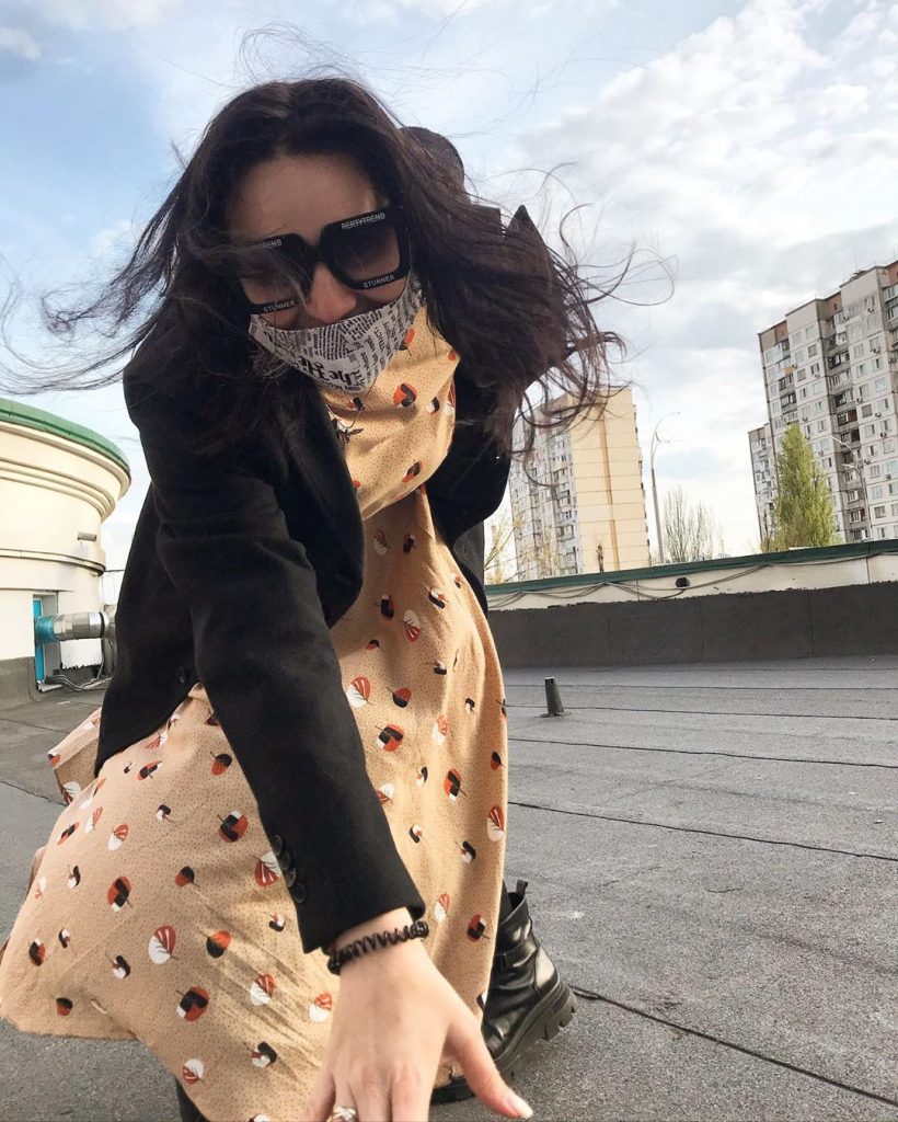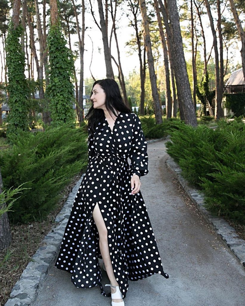 Der berühmte ukrainische Führer hat ein langes schwarzes Kleid in einer großen weißen Erbsen gewählt. Populärer Geruch und hohe Aussparungen betonte alle Gewinnseiten der führenden Figur. Solomia wählte ein solches Bild, um mit Anhängern seiner Eindrücke der nächsten Reise von der Ukraine teilzunehmen. Später, in demselben Abschnitt, erschien ein Foto, wo der Anführer wieder langen Kleider in Erbsen, jedoch nicht mehr schwarz und gelb ist.