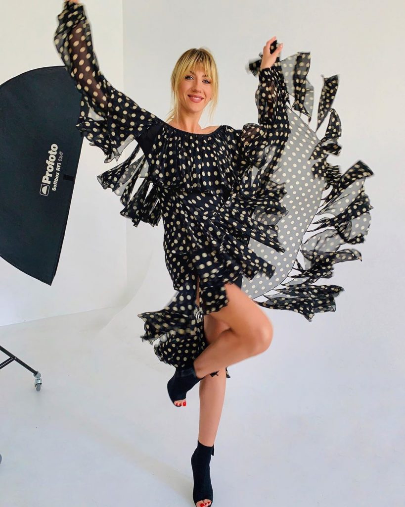 Als Grüße im Urlaub von Ivan Kupala hat der ukrainische berühmte Führer ein Foto in einem ungewöhnlichen schwarzen Kleid in weißen Erbsen veröffentlicht. Der durchscheinende Chiffon und viele Ruders machen das Bild des Sternlichts und der Gewichtslos.