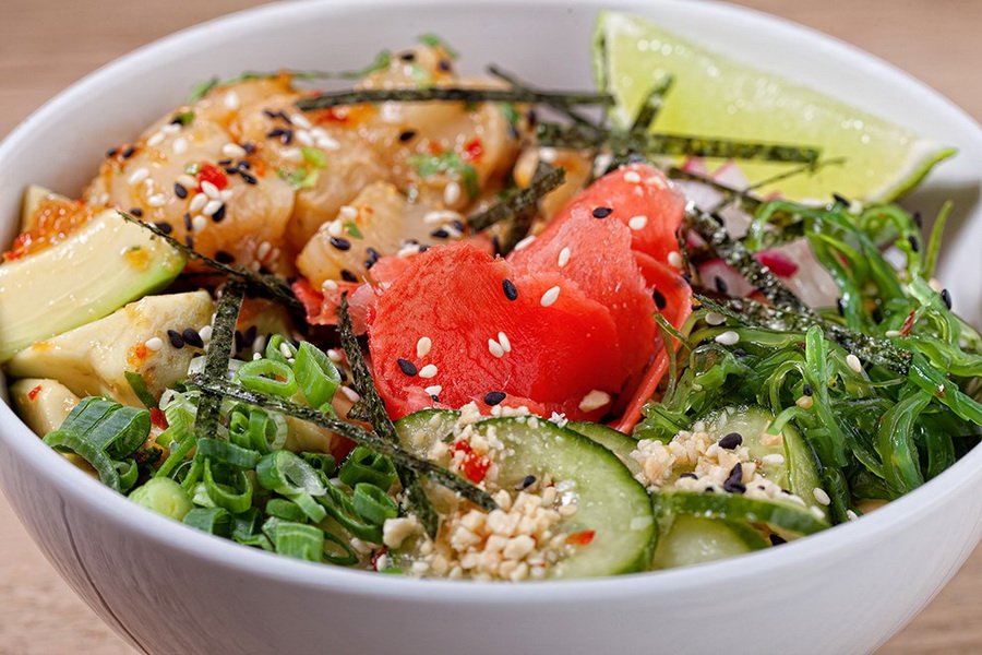 Dieser Geschmackssalat ähnelt Sushi, aber Sie brauchen nichts zu drehen. Für leichtes Essen, 60 g Lachsfilet, 80 g Reis für Sushi, 25 g süßes Salat, 15 g marinierter Ingwer, 1 kleiner Avocado, ½ Gurke, 1 Rettich, 3 Esslöffel, 3 Esslöffel. Sojasauce. Für die Dekoration können Sie fein abgeschnittene Blätter von Burrows und Sesam verwenden. Reis ist gepaart, füllen Sie es mit Reisendesig mit Zucker nach Geschmack. Lachsfiletschnitte, Gurkenkreise, Rettiche auch Kreise. Legen Sie sich in den Kabelreis, Lamm, Ingwer, Lachs, Gurken, Radieschen, Loch, Sesam und Grünzwiebeln. Servieren Sie auf einem Tisch mit Sojasauce.