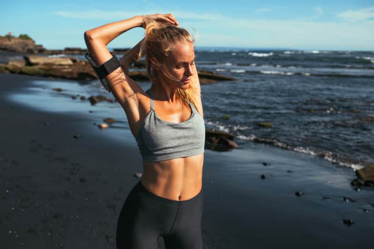 6. Lügen Sie für die nächste Übung genau auf den Boden. Beide Beine heben sich in den rechten Winkeln vertikal an. Hände setzen an die Seiten. Das Torso heben versuchen, mit beiden Händen gleichzeitig mit beiden Händen nach außen von seinen Beinen zu gelangen, als sie sie umarmen. 30 Mal leisten.