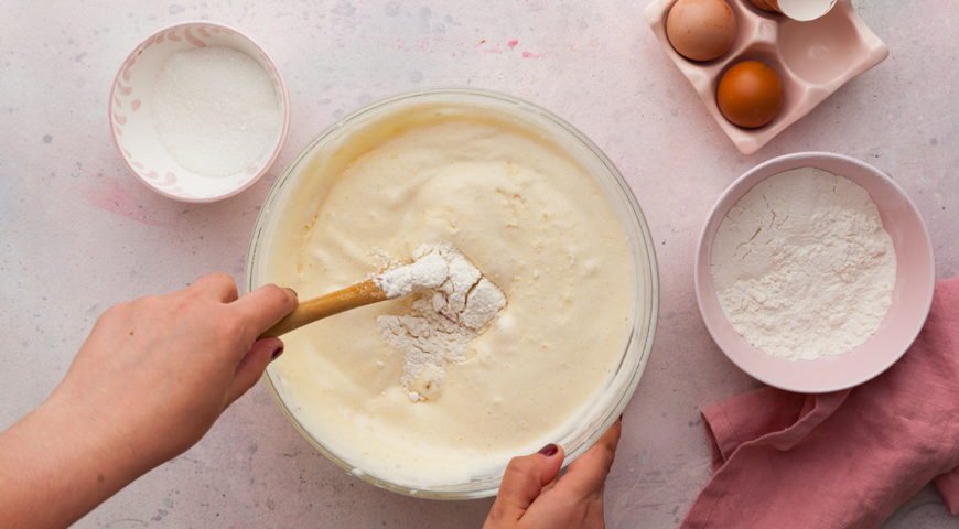 5. allmählich (nicht alles richtig!) Mehl hinzufügen. WICHTIG: Mischen Sie die Masse nach jedem angehängten Teil kreisförmiger Bewegungen nur auf eine Weise.