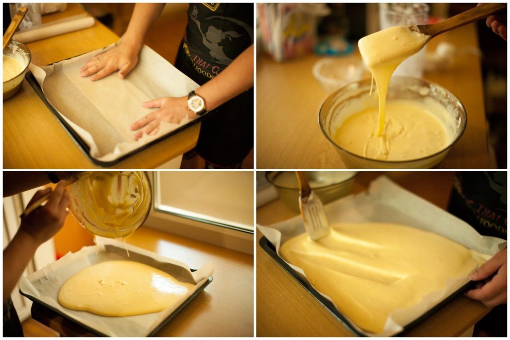 7. Befestigen Sie das Formular zum Backen mit Pergament. Den Teig hinuntergießen.Wichtig:Gießen Sie einen dünnen Strom aus, damit die gesamte Luft aus dem dort liegenden Teig kam. Verteilen Sie den Van der Masse sanft nach Form, und versuchen Sie, Luftblasen zu bemerken und zu entfernen. Wir erhöhen das Formular und klopfen es mehrmals auf den Tisch.