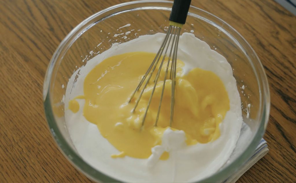 2. Separate Proteine und Eigelb. Besiege die Proteine mit einem Mixer.Wichtig: Mit niedriger Geschwindigkeit verbreiten. Wenn es einen charakteristischen "Seifenschaum" gibt, fügen Sie Zucker hinzu. Erhöhen Sie nach dem zusätzlichen Zucker die Geschwindigkeit des Mischers (zum Beispiel, wenn Sie 6 Geschwindigkeiten haben, aktivieren Sie 5). Brennen auf eine dicke Konsistenz, so dass die Masse auf einem Mischerhut gut aufbewahrt wird.