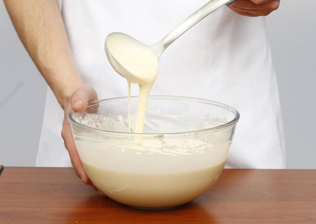 6. Wir setzen eine manuelle Vinch, fügen eine Mischung aus Milch und Honig hinzu. Gießen Sie es in eine tiefe Schüssel mit einem Kreis in der Nähe der Wände.Wichtig:Mischen Sie die Schaufel zuerst die oberste Schicht des Teigs und nur dann den gesamten Teig. Mischen Sie nur in einer Richtung, kreisförmige Bewegungen von oben nach unten. Dann klettern wir die Kapazität mit einer Mischung und klopfen es mehrmals auf den Tisch. Dies ist wichtig, dass der Teig die Überreste der Luft herauskam, und der Kuchen hat eine spezifische "schwammige" Struktur erworben. Wir verlassen den Teig 15 Sekunden lang.
