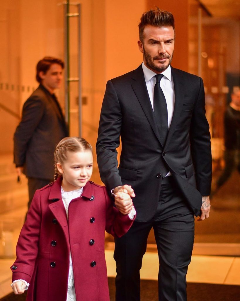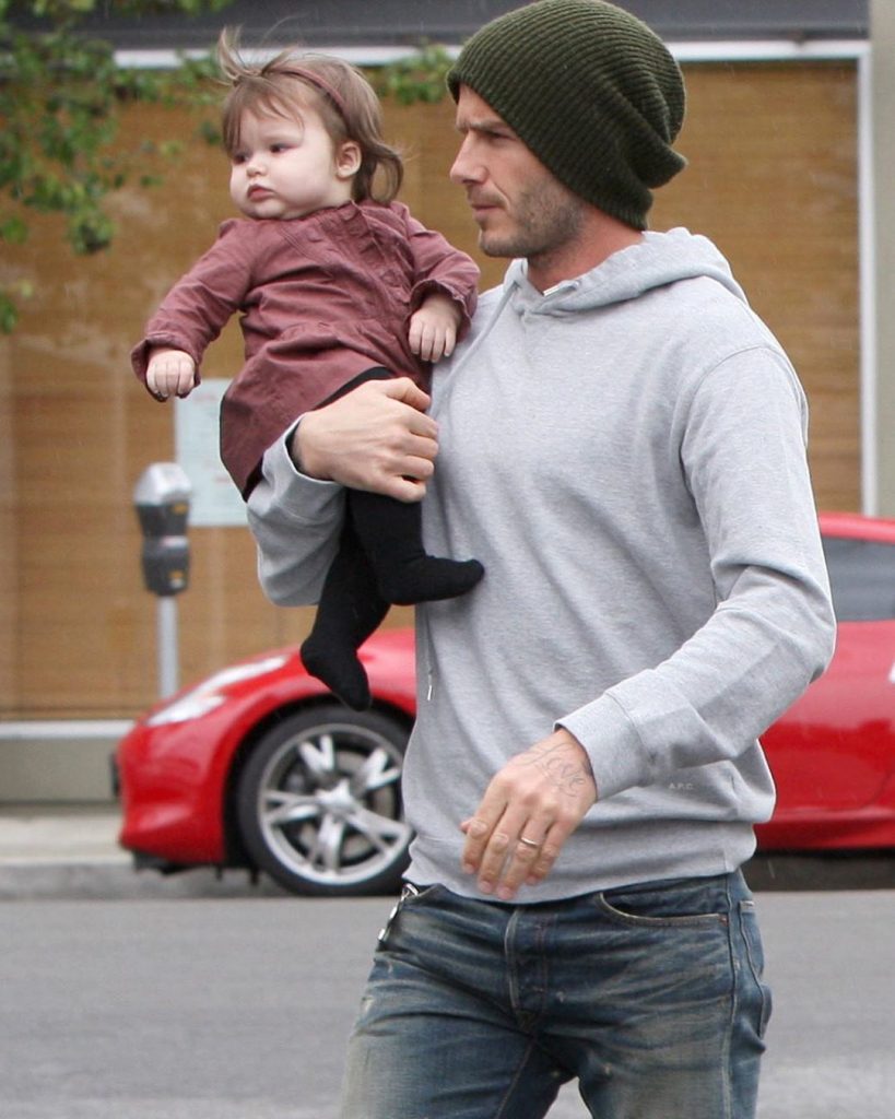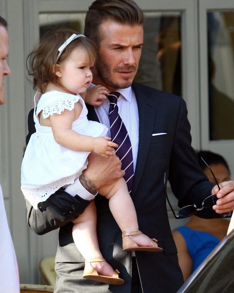 Kleine Dame begleitet Papa und auf Fußballspiele. Es ist die Tochter, die Sie am häufigsten neben David auf den Fußballständen finden, trotz der Tatsache, dass es drei Söhne hat. Wenn ein Sternpaar auf den Spielen zusammenscheint, ziehen sie an, sowie das Spiel selbst.