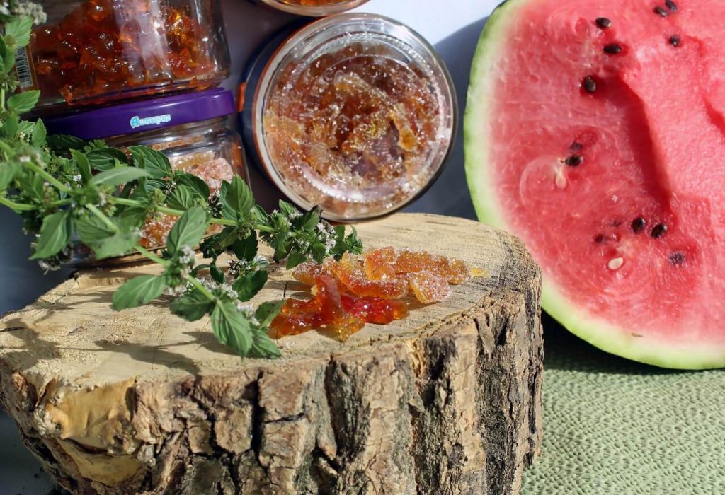 Für eine gute Sache brauchen wir 1 kg. Weiße Haut der Wassermelone (ohne Zellstoff und ohne grüne Außenschale) und 500 g. Zucker. Die Schale schneidet mit Würfeln 1 cm x 1 cm. Mit Zucker vorgeschlagen und 12 Stunden an einem warmen Ort verlassen. Die resultierende Mischung beträgt 10 Minuten. und verlassen, um gesäumt zu werden. Holen Sie sich einen Kandidaten und fügen Sie einen Teelöffel Zitronensäure in den Sirup hinzu. Sirup wird 15 Minuten lang gekocht, füge kandierte hinzu und geben Sie alles für weitere 15-20 Minuten zusammen. Lassen Sie eine Mischung bis zum Futter. Unterrichten Sie dann Süßigkeiten für das Pergament und trocknen Sie 1 Stunde in einem Ofen. bei einer Temperatur von 100 Grad. In diesem Fall muss der Ofen geöffnet werden. Dann sollten die Süßigkeiten noch 3 Tage bei Raumtemperatur auf einem Fach getrocknet werden. Bereite Süßigkeiten können mit Zucker besprüht werden, so dass sie nicht klebten. Bewahren Sie die Leckereien in einem Glasbehälter auf.