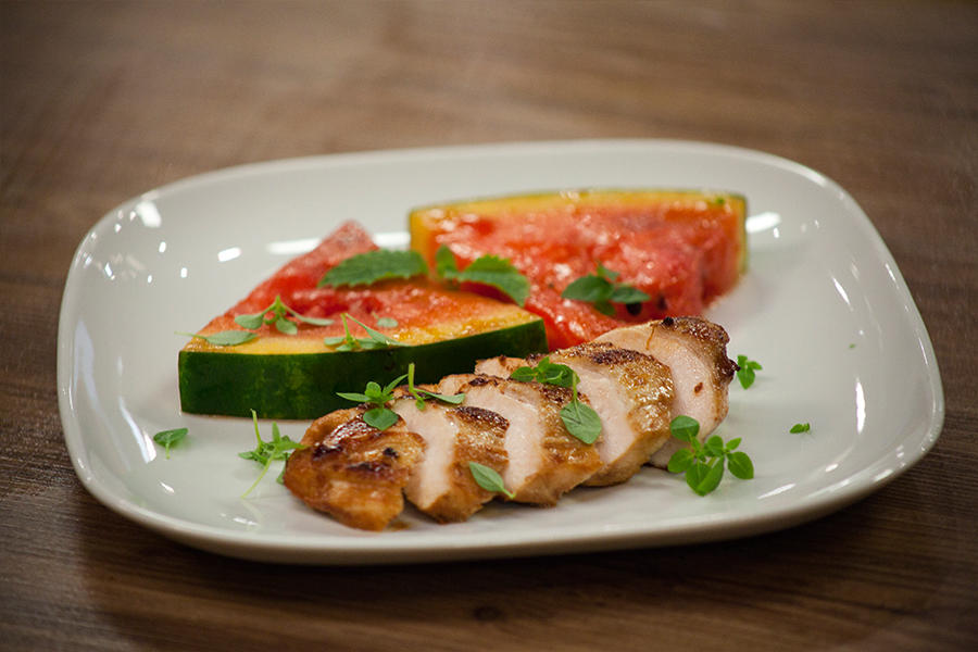 Zuerst, bereiten Sie Marinade vor: Ich sei den Orangensaft, füge 1 Esslöffel Sojasauce hinzu, und so viele Zucker, schneiden Sie dort Wurzel von Ingwer mit Schale, und fügen Sie einige Knoblauchzähne hinzu. In Marinade 2 Hähnchenbrust für 1 Stunde eintauchen. Schneiden Sie die Wassermelone zusammen mit Scheiben mit dreieckigen Stücken, Dicke - nicht weniger als 1,5 cm. (Über dem mit heiß erhaltenen Formular). Steine abtragen. Braten Sie ein Huhn zuerst in einer Pfanne, und backen Sie dann in einem Ofen, bis Sie fertig sind. Marinade, die stand, stammt durch ein Sieb. Fügen Sie auf einer Pfanne Öle und Marinaden und in dieser Mischung auf großer Wärme für eine leicht bratische Wassermelone hinzu. Gehen Sie nicht runter, die Mitte sollte frisch sein. Lehren Sie ein fertiges Huhn für Wassermelone, schmücken Sie ihre Grünen.