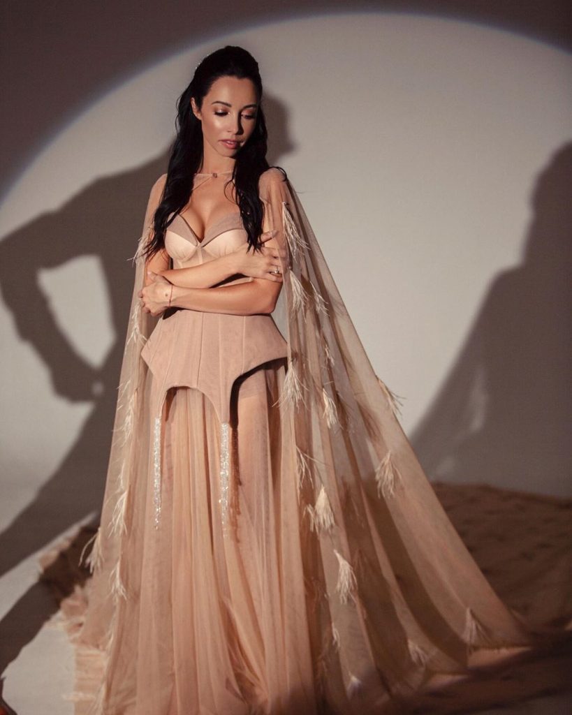 In diesem schönen Bild posiert die Ballerina in einem beige Ensemble. Es beinhaltet ein Korsett mit einer würzigen Dekoration und einem brillanten Fransen, einem langen Fettrock und einem Kap, einer Verlängerung von Federn. Catherines Haare wurden in einer eleganten Frisur entfernt, im Gesicht - ein sanftes, kaum spürbares Make-up.
