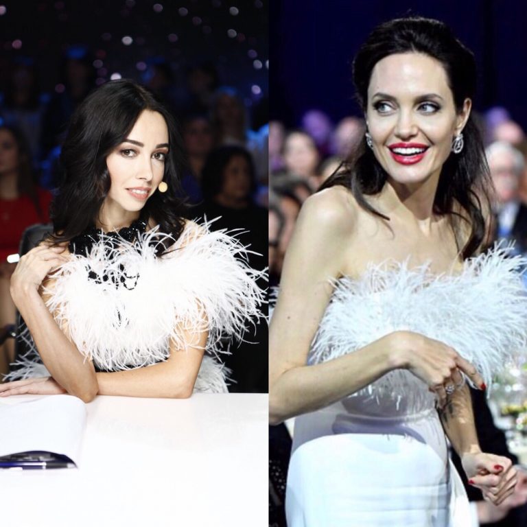 Nachdem Angelina Jolie einen echten Furor verursachte, der in einem weißen Kleid mit Federn auf einem roten Pfad der Zeremonie 'Choice Awards erscheinte, entschied sich Katerina Cook, daran zu erinnern, dass früher auch einwandfrei in einem ähnlichen Bild aussah. Dieses Outfit kann mit einem weißen Swender mit Kleidung vom Ballett "Lebedin Lake" verglichen werden. Katerina ergänzte sein Bild mit einer spektakulären schwarzen Halskette und einem breiten schwarzen Pass und Angelina - Diamantohrringe und hellrotem Lippenstift.