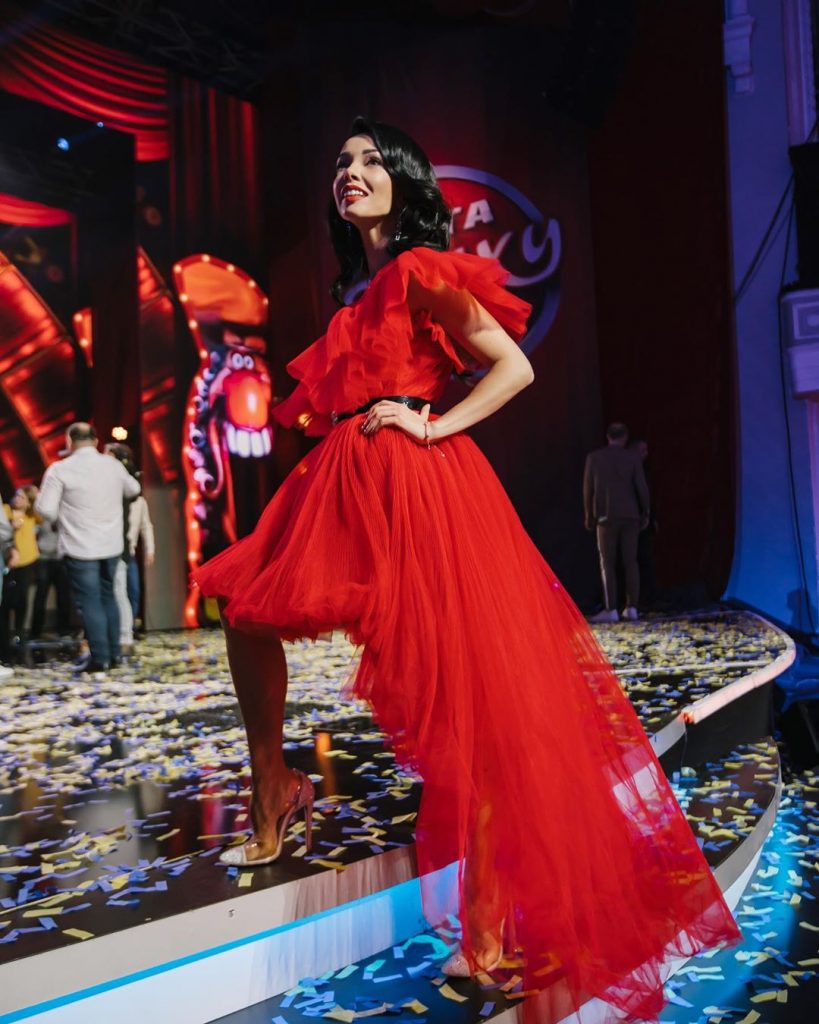 Dieses Bild beweist erneut, dass Katerina ihre Anhänger mit einem stilvollen Kleid überraschen kann. Rotes asymmetrisches Kleid mit üppigen Ärmeln aus einer limitierten Sammlung von H & M und Giambattista Valli sitzt erstaunlich auf einer Ballerina und betont ihre tadellosen Figur.
