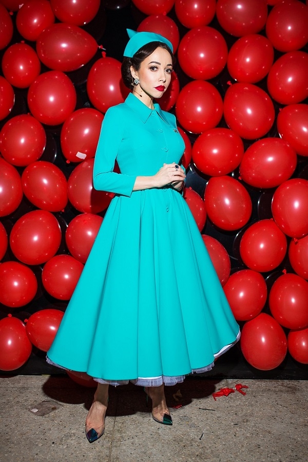 Der Feiertag von Halloween Ballerina hat das Image der Schwester von der seriellen seriellen amerikanischen seriellen Serie entschieden. Kleid im 40-IES-Stil hat eine Farbe Tiffany, sowie ergänzt durch Accessoires in Form von Handschuhen und dem Hauptkleid der Krankenschwester. Fans der Sterne waren angenehm von diesem Bogen beeindruckt - sehr raffiniert und hell gleichzeitig.