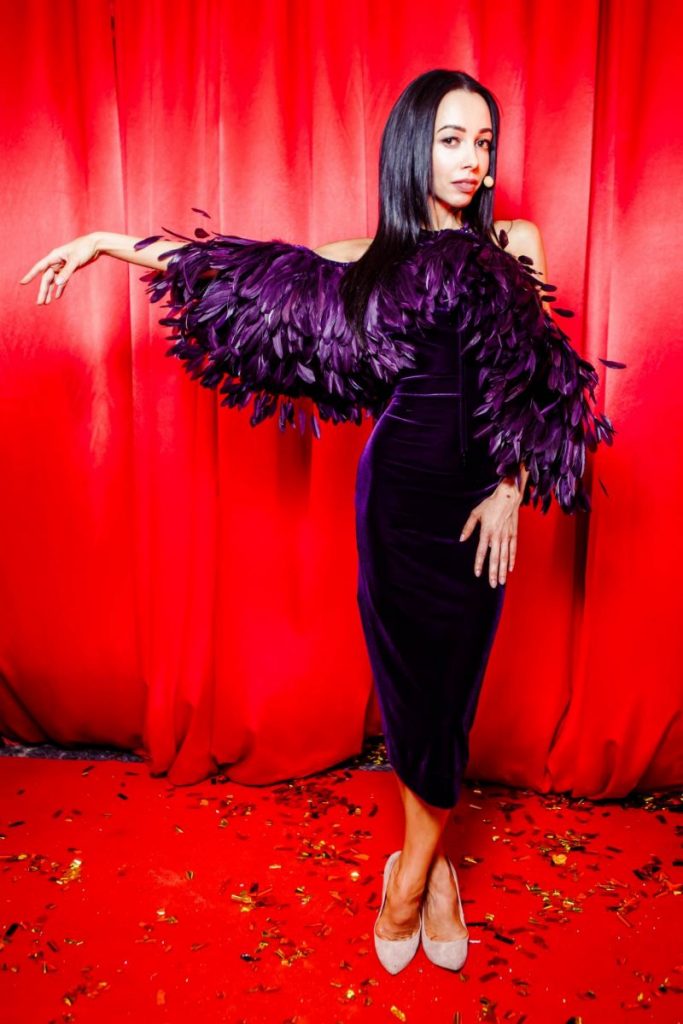 Trotz der Tatsache, dass Catherine-Kommentare in der Show ziemlich scharf sein können, bleibt er eine sanfte und zerbrechliche Frau. Zum Beispiel sieht die Ballerina in diesem Bild wie ein magischer Vogel aus. Gesättigte lila, Federn und extravagantes Make-up - all dies macht den Bogen hell und unvergesslich. Es muss zugegeben werden, dass eine ungewöhnliche Farbe des Kleides sehr weidet, um das dunkle Haare Catherine zu weiden.