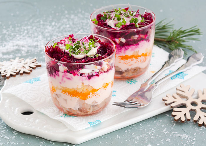 Ändern Sie die Idee traditioneller Gerichte! Hering unter dem Pelzmantel kann so präsentiert werden, dass die Gäste erfreut werden.