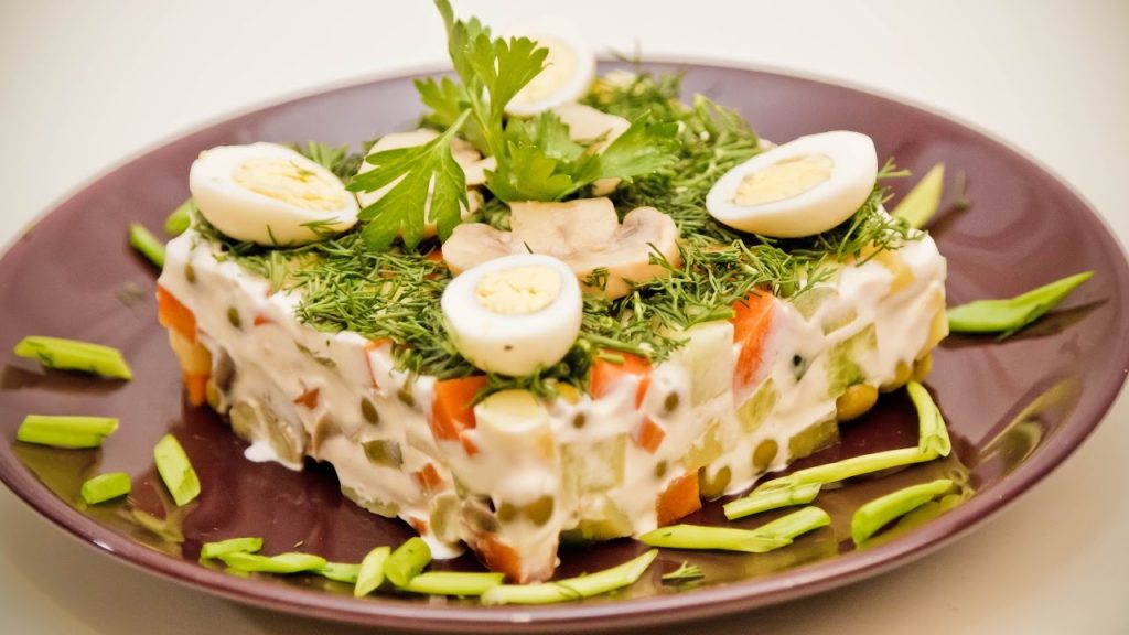 Bereiten Sie alle Komponenten vor: Gemüse und Eier brauchen Koch, sauber. Zwiebel fein schneiden und kochendes Wasser gießen. Pilze mahlen Würfel und Braten auf Butteröl (schneiden Sie nicht mehrere Pilze, Fry Integer). Marinierte Gurken schneiden sowie den Rest der Produkte. In einer großen Schüssel geben Sie alle Zutaten ein, fügen Sie ein wenig Salz und Mayonnaise hinzu. Mischen Sie gut und unterwerfen Sie sich an den Tisch, verziert mit gebratenen ganzen Champignons.