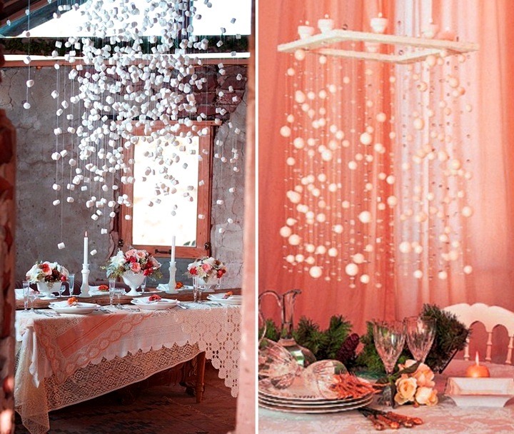 Dieses Dekor gibt Ihnen ein Wintermärchen, unabhängig von den Whirlpools. Leicht wird von selbst mit Wolle, Threads und PVA-Klebstoff hergestellt. Montiert an Kronleuchter oder Fenstereisen. Für Lasunchik gibt es auch eine Vielzahl von Schneefällen aus Marshmelow.