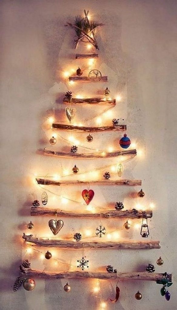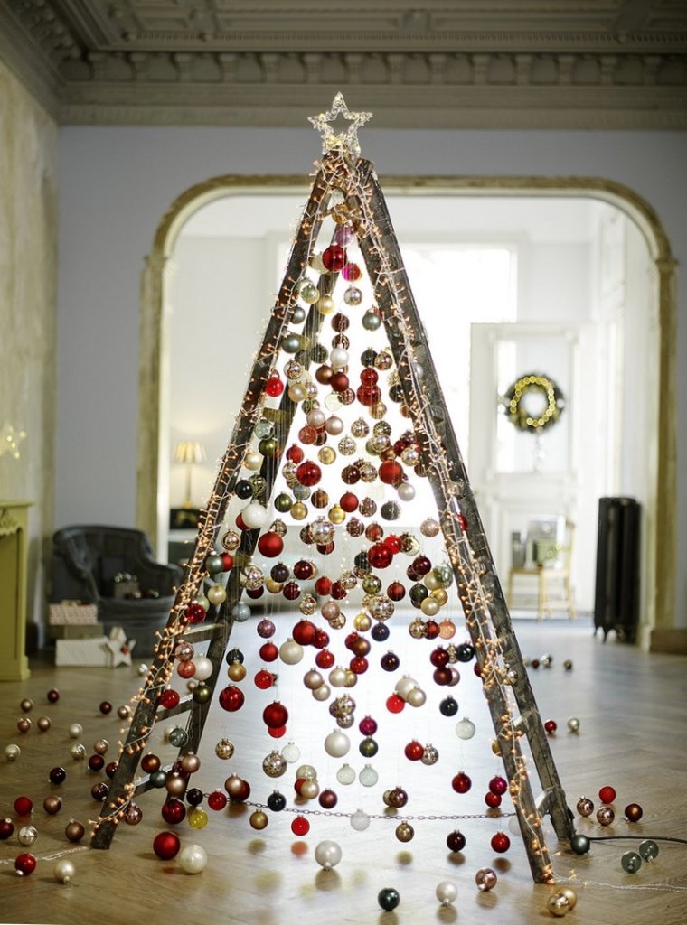 Wenn Sie nach dem neuesten Weihnachtsbaumkonzept suchen oder sich um die Ökologie kümmern, dann ist dies Ihre Option. Auf der Leiter befindet sich leicht elektrische Girlanden und im Raum zwischen den Stützen mit Hilfe von Neujahrskugeln auf den Threads unterschiedlicher Länge, um einen modernen Autorbaum zu bilden. Sie können auch einen Weihnachtsbaum von den Brettern an der Wand herstellen.