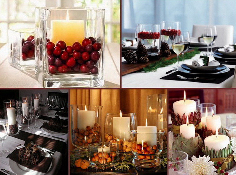 Machen Sie solche Kompositionen ziemlich einfach. Dazu benötigen Sie Kerzen, breite Gläser oder Sonderformen für Kerzen sowie eine Prise Ihrer Fantasie. Um die Kerzen können Sie als traditionelle Elemente des neuen Jahres platziert werden, und was Sie sich im neuen Jahr gewünscht hätten. Zum Beispiel Geld, ausschneiden Herzen oder nur Blütenblätter von Rosen, Süßigkeiten, von Stickerei, Flugzeug usw.
