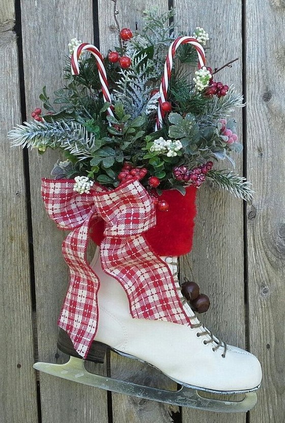 Eine wunderbare Dekoration für Ihr eigenes Haus mit Kamin oder mit einem großen Korridor. An den Stiefeln kann Elf seine Gummistiefel vorübergehend drehen, um sie mit einem roten Tuch abzudecken. Innen, nehmen Sie den schönen, Hochwasserzweig auf und schmücken Sie es mit dem Dekor des neuen Jahres. Um die Zusammensetzung kann mit künstlichem Schnee behandelt werden, als ob jemand nur aus einem frostigen, schneebedeckten Wald kam. Für die Herstellung dieses Schmucks wird auch der alten Skates passen.