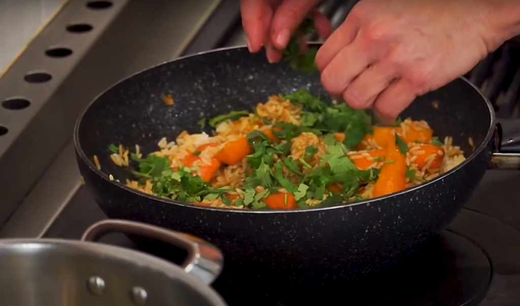 Reis kochen. Karotte sauber, in Hälften geschnitten (oder in Quaters, je nach Größe), 5 Minuten kochen. Zwiebel und Knoblauch fein hacken, Ingwerrost. Paprikapfeffer schneiden in dünne Ringe. Alles, was in ein hohes Bratpfannen-Wok auf einem erwärmten Olivenöl eingesetzt wird, fügt dem selben Sesamöl hinzu, in denselben Sesamöl, Turmarker, Sojasauce. Braten Sie die Mischung zu einer goldenen Farbe, fügen Sie ihm eine Karotte hinzu. Füge Ahornsirup hinzu und braten, Rühren, eine Minute. An einem Bratbrei teilen, ist alles gut gemischt, um weitere 2 Minuten zu rauchen und bereit. Das Gericht ist mit zerquetschten Cila eingerichtet.