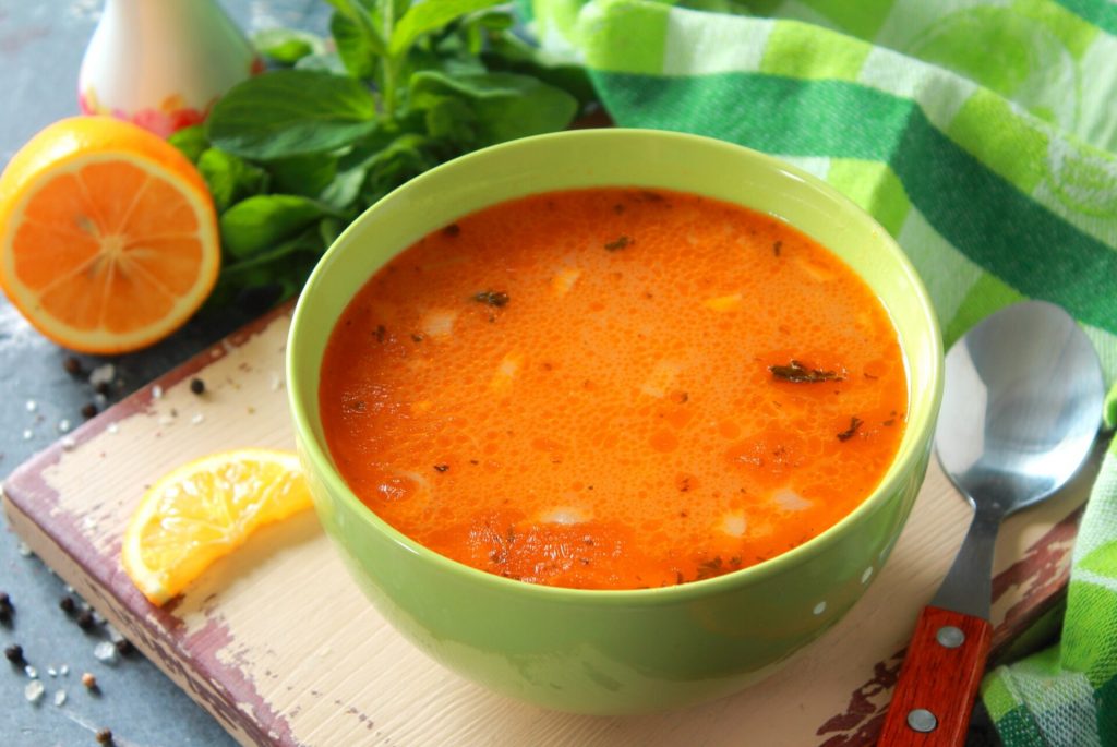 Linsenrot - 80 Gramm, Bulgur - 80 Gramm, Wasser - 1,5 Liter, Zwiebeln - 1 Stück., Tomaten in eigenem Saft - 4 Esslöffel (kann durch Tomatenpaste ersetzt werden - 2 Esslöffel), Knoblauch - 2-3 Nelken, Minzfrisch - 2 Zweige (falls trocken, dann 1 Teelöffel), Kurkunst - 1 Teelöffel mit bitterer, Zitrone - 2-3 Scheiben für Suppe und mehrere Scheiben zum Füttern, Salz, Pfeffer.