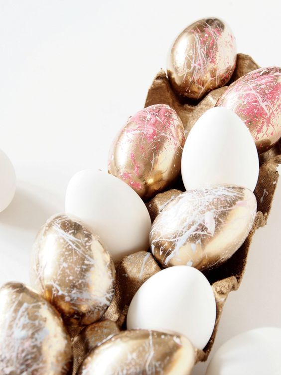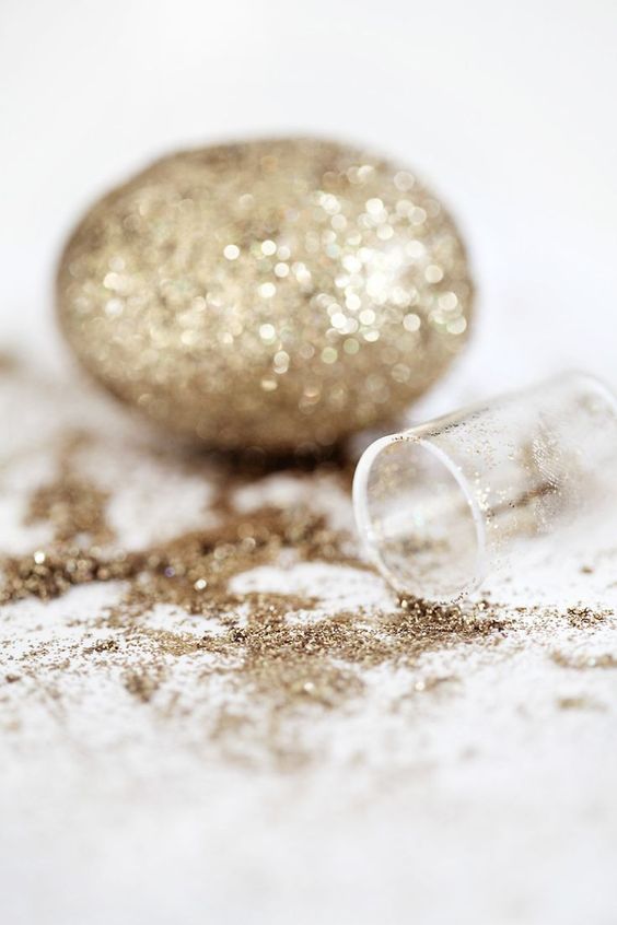 Nein, was? Vielleicht wollen die Eier auch im Trend sein! Dekorieren Sie sie mit Funkeln oder Konfetti - auch einem trendigen und Weg. Dazu können Sie auf sie kleben und im "goldenen Pulver" zusammenbrechen. Oder machen Sie es Punkte: Tragen Sie einen Klebstoff an, um Bereiche zu trennen und mit einem Farbblock von oben zu streuen.