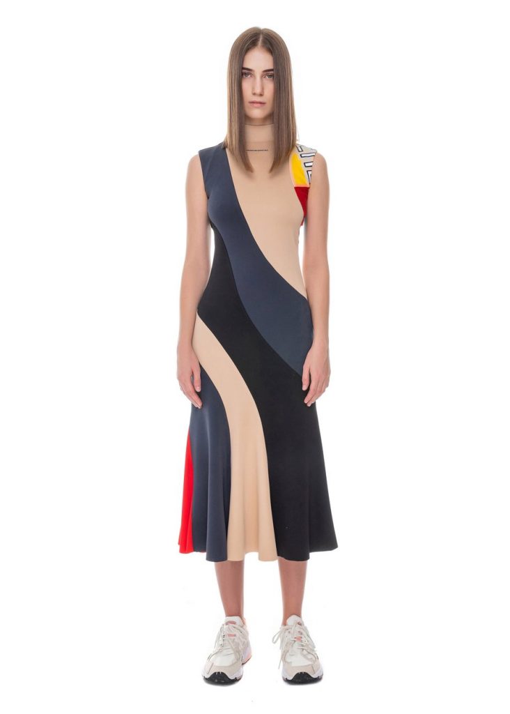 5. Ein ärmelloses Minenkleid, das einen Druck von gemischten Farben hat: rot, schwarz, gelb und nackt. Nicht standardmäßige und mutige Kombination!