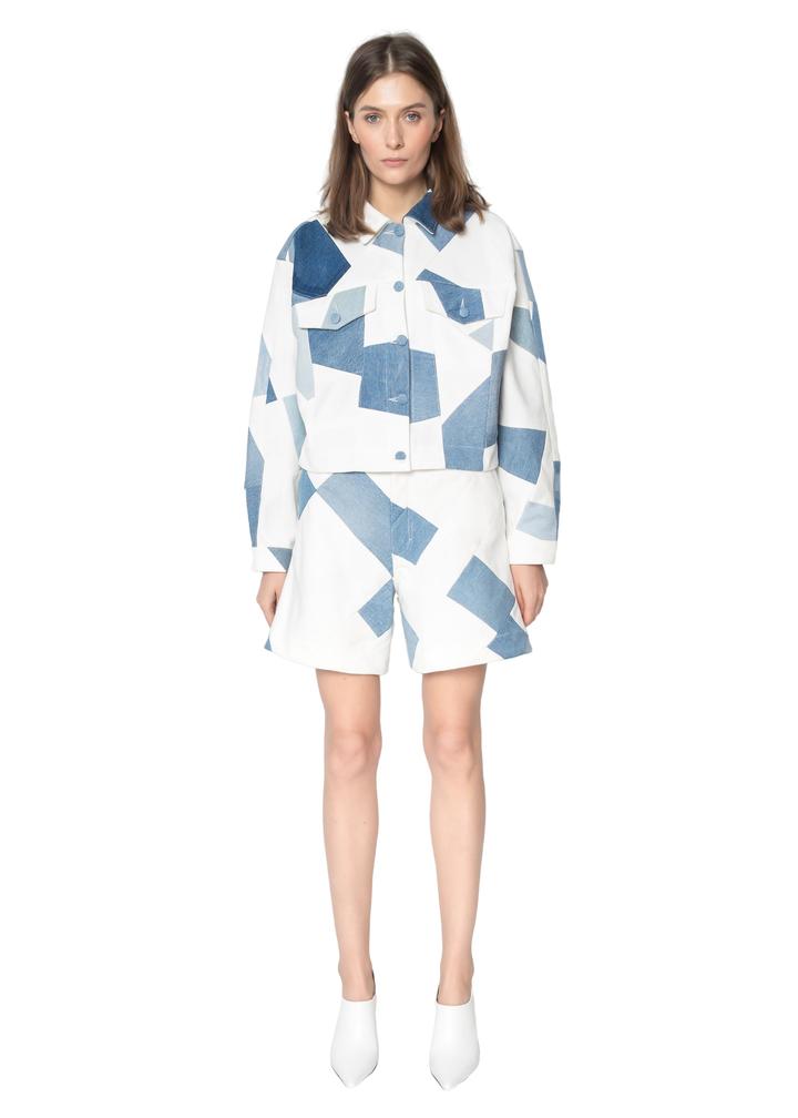 2. Gemischter blauer Anzug mit Jeans fährt auf weißem Tuch. Ideal für Sommerspaziergänge, Fotoschießen in stilvollen Studios und Modepartys.