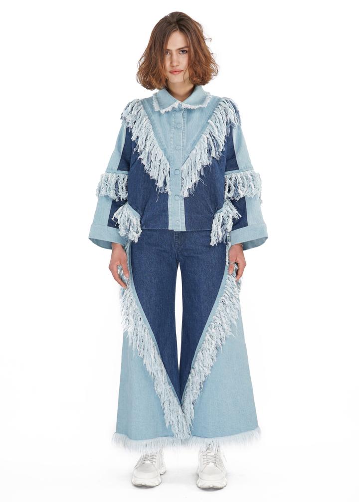 1. Wide Cowboy-Jeans mit einem sperrigen diagonalen Fransen - ein nicht-Standard-Modell, das eine Stimme von Hippies hat. Symmetrie fügt die Extravaganz des Bildes hinzu, und vor allem Seife in ihm sieht ein Kragen aus.