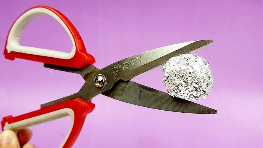Wenn Ihre Küchenschere langweilig ist und das Gefühl ist, dass Sie Ihre Kräuter geben, anstatt zu schneiden, versuchen Sie diesen Trick. Sie können die Schere mit Aluminiumtechnologie schärfen. Alles, was Sie tun müssen, ist mehrmals Aluminium in der Schere geschnitten und wird schwerwiegender. Probier es aus!