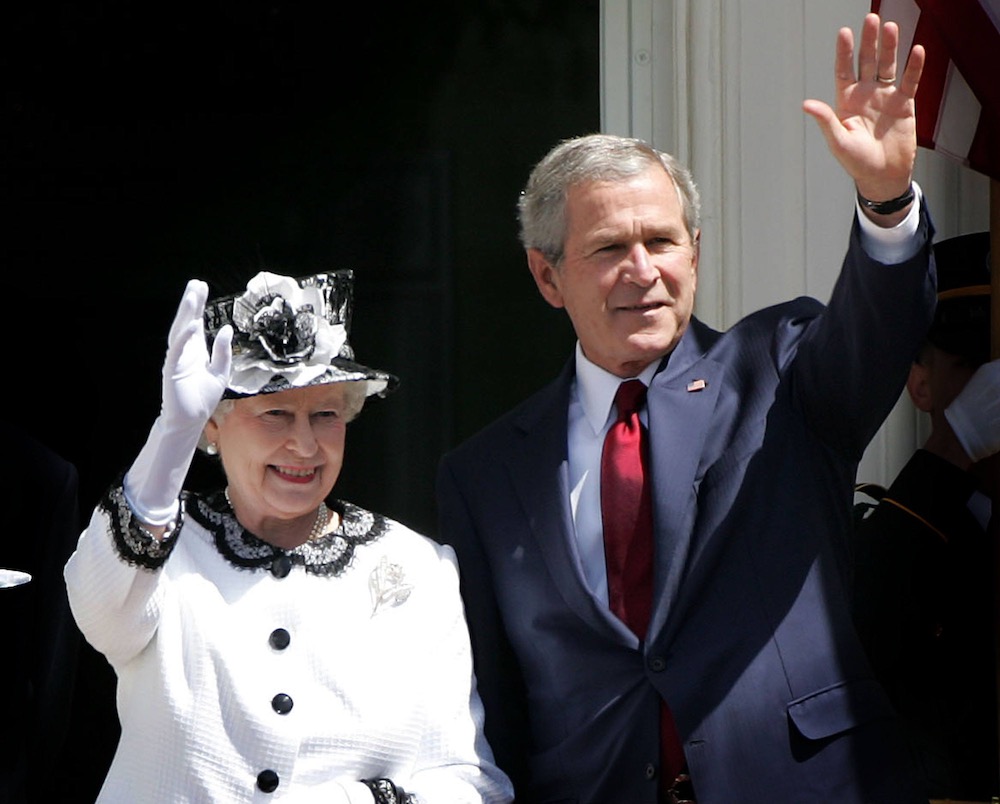 10.George W. Bush, ähnlich sein Vater, als sein Vater die Königin im Jahr 2001 im Buckingham Palace traf.