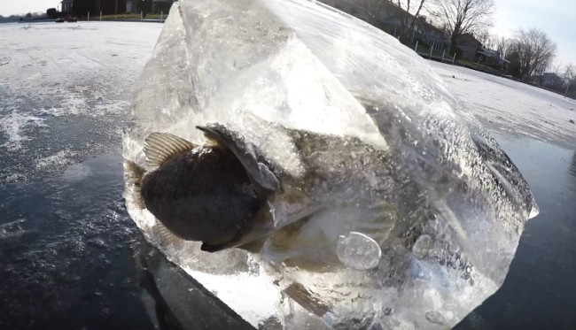 Schau dir dieses Bild genau an. Es kann ein paar Minuten dauern, bis Sie endlich verstehen, dass ein Fisch einen weiteren Fisch isst, wenn er eingefroren wurde. Und ein Moment, um einen vollen Griff auf sein Essen zu nehmen, wurde überraschend von einem Eisfischer entdeckt.