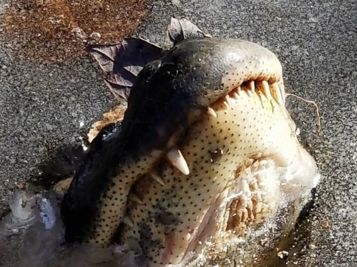 Alligatoren sind eine der zählbaren Anzahl von Arten, die mit den Dinosaurier bestanden. Ja, sie konnten überleben, was diese gigantischen Zahlen nicht taten. Natürlich haben sie alle diese Zeiten mit einigen Tricks überlebt, z. B. dieses, das Sie auf dem Bild sehen können. Wenn es um gefrorene Alligatoren geht, sind die Chancen dieses Geschehens sehr geringer, da diese Art stark genug ist und unter dem gefrorenen Eis leben kann!