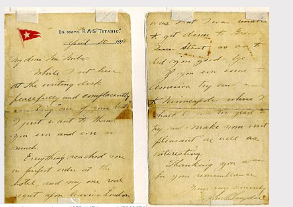 Also wurde dieser Brief an einen Inhaber eines Londoner Tabakshops gerichtet und wurde von John Snyder, Mann an Bord von R.M.S. geschrieben. Titanic. Der Brief gelesen: "Während ich hier am Schreibtisch sitze, rauchen Sie friedlich und raucht das Rauchen von 'eines Ihrer besten Zigarren', möchte ich Ihnen nur danken." Dieses Stück wurde am 10. April 1912 geschrieben. Nur zwei Tage, bis Titanic am 14. April 1912 sein unerwartetes Ende erfüllte.