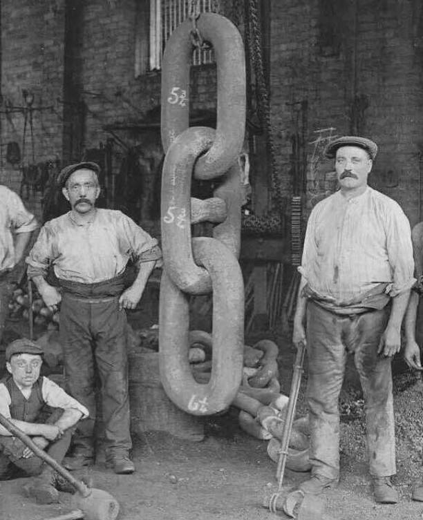 Dieses Bild beschreibt treffend die gigantische Größe des Schiffes. Einige Bauarbeiter, die um die Kettenglieder standen, die für Hingley-Anker des Schiffes 1910 aufgebaut sind. Sie müssen nicht sagen, dass die Kettenglieder in der Größe riesig waren.