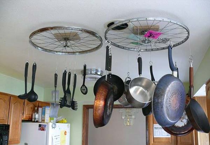 Einige denken vielleicht, dass diese Familie ihre Versiegelung verdorben hat, aber nicht so fühlen sie sich dabei. Wenn jemand ein Geschäft aufbauen kann, um Hausschuhe aus Reifen herzustellen, können alte Radräder ein guter Küchenaufhänger werden.