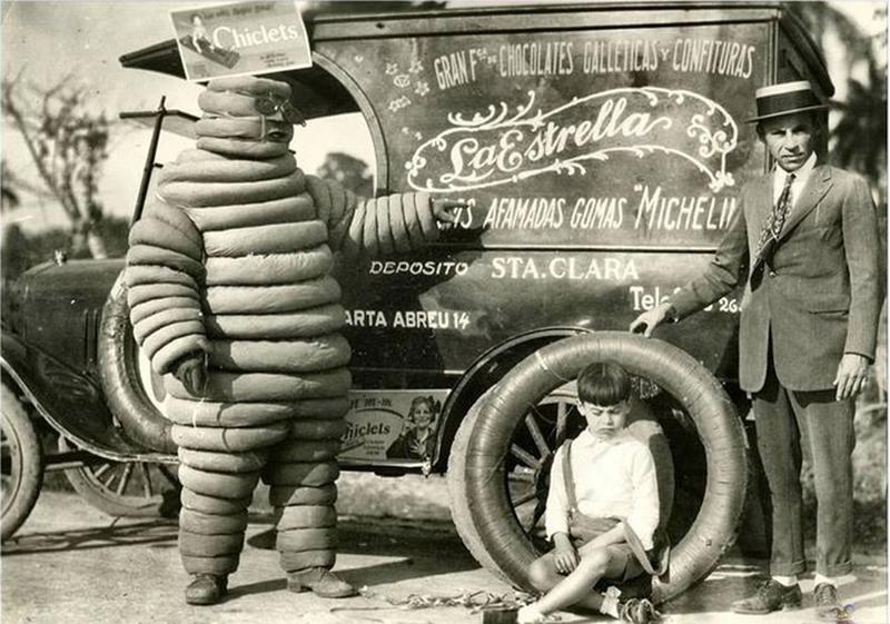 Es ist keine Szene aus einem B-Science-Fiction-Film, sondern eine eigentliche Werbung von Michelin-Reifen. Die Reifenkreatur erschien ab 1898. Der Reifenmann wurde auf der ganzen Welt berühmt und da die Reifen dicker wurden, tat der Reifenmann.