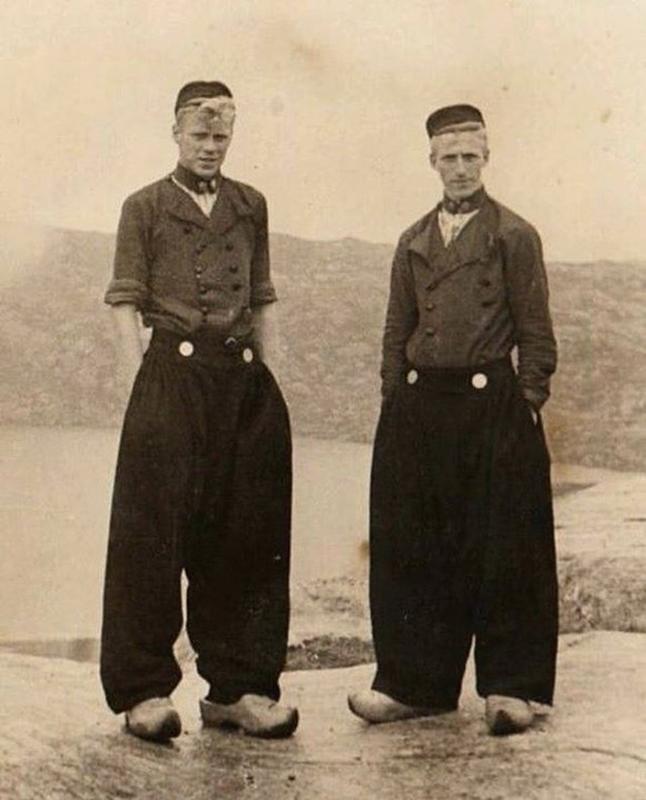 Die Jungs auf dem Foto tragen tatsächlich ihre traditionellen Hosen, die buchstäblich zwei oder vielleicht drei Leute in ihm passen. Wir wollen nicht, Spaß an der Tradition oder irgendetwas machen, aber das ist etwas wirklich seltsam. Ballonförmige Hosen mit Zweireiher Shirts. Gott sei Dank sehen wir diese Art und Weise nicht mehr. Aber noch, wissen diese Dutchmen, wie es in der Art zu tragen.