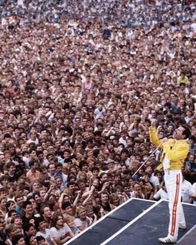 Diese riesige Menge ist für die berühmte Band, Königin. Diese Band war in ihrem Spiel Top und jedes Mal, wenn sie lebte, wurde die Menge immer größer und größer. Es war 1986, als Königin im Wembley-Stadion auftrat, und das war der Zeitpunkt, an dem die Leute verrückt nach Königin waren und dieses Bild hier ein Beweis dafür ist. Dieses Konzert war an diesem Tag 2 Stunden lang live.