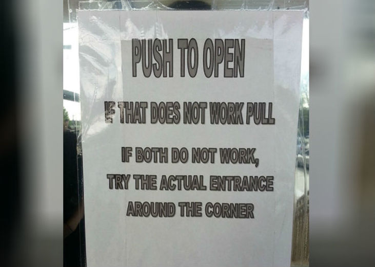 Die meiste Zeit, in der die Menschen, die im Laden einkaufen, widmen, um die Tür zu drücken und zu ziehen. Deshalb hat der Ladenbesitzer dort ein Poster aufgehängt. Also, Leser, wenn Sie müde werden, die Tür dieser gefälschten Tür zu drücken und zu ziehen, können Sie den echten ausprobieren.