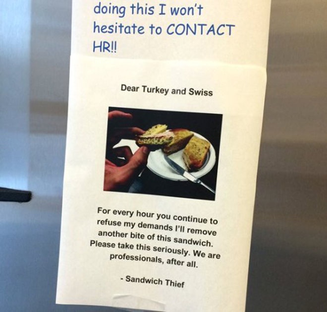 So schreiben Sie eine Notiz und machen jemanden, was Sie tun möchten. Die Leute erpressen oft eine andere Person mit etwas Ernster. Aber hier hat der Blackmailer das Sandwich des Subjekts entführt und warnen, dass die Person seinen Anweisungen einhält, sonst kann das Sandwich nicht helfen.