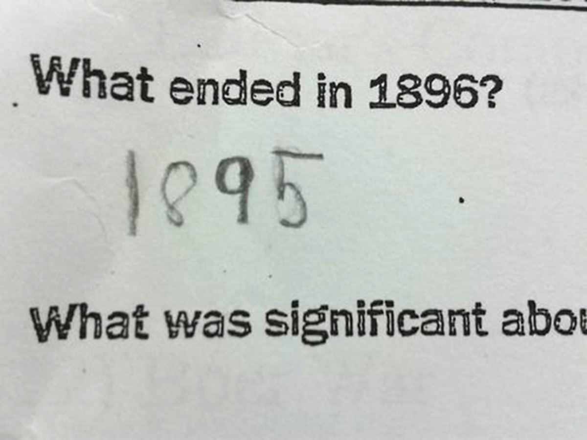 Unterschätze niemals die Schüler und ihr Wissen. Wer hätte gedacht, dass jemand diese Frage auf diese Weise beantworten würde? Interessanterweise können Sie nicht einmal die Antwort falsch anrufen. Denn das ist das, was 1896 endete. Ich habe ein Bauchgefühl, das dieser Mann fühlt, wird es groß machen!
