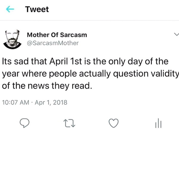 Es ist ein ernsthafter Tweet mit einer Prise Sarkasmus. Der Tweet schlägt heutzutage auf das ernsthaftste Sorge. Auf die Fakung der Nachrichten. Es wurde beobachtet, dass viele gefälschte Nachrichten in der Gesellschaft zirkuliert und die meisten von ihnen nur von Nachrichtenmedien verbreitet werden.
