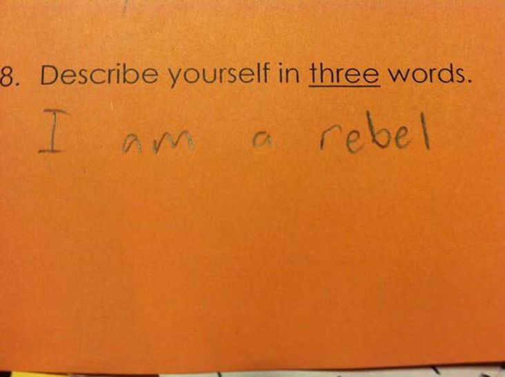 Rebellen gehorchen niemals der Regel. Die Frage war die Begrenzung der Person nur auf dritte Worte, aber der Antworter rebellierte auf seine Weise dagegen. Er hat sich selbst beschreiben, aber in vier Worten. Diese Person wird sicherlich etwas großes tun.