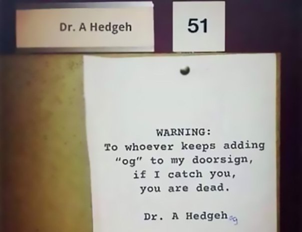 Wie kann jemand widerstehen? Der Mann wurde mit Menschen satt, die "-og" auf seinem Türschild hinzufügt. Schließlich ist er müde von all dem, entschied er sich, eine Mitteilung auszugeben. Leider hat die Person, anstatt Rücken zurückzudrängen, wieder. Und das ist einfach großartig. Wir fragen uns, wie Dr. Igele darüber gefühlt sein muss. Hoppla! Entschuldigung, Dr. Hedge.